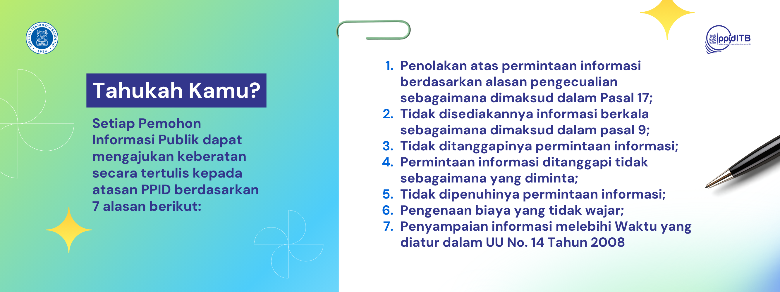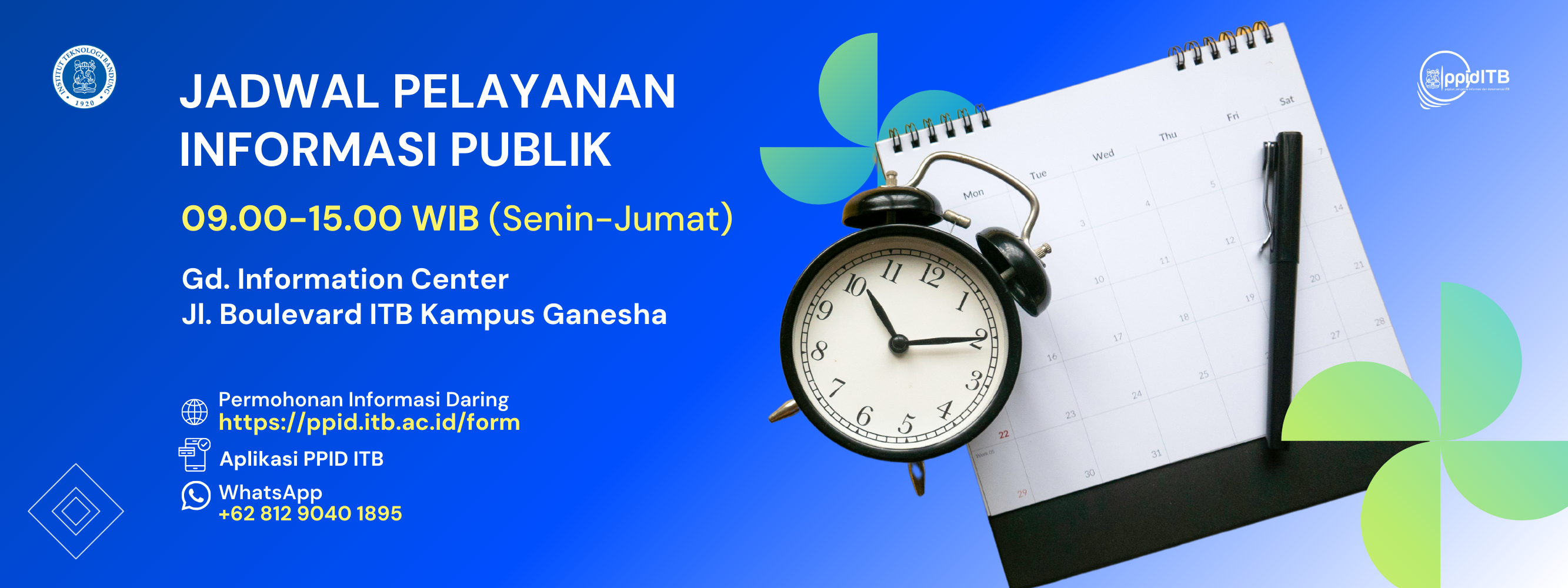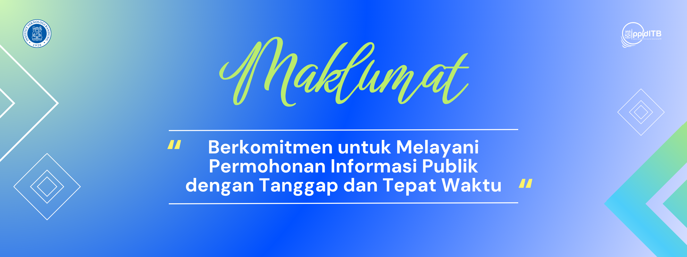 ITB sebagai badan publik berkewajiban untuk memfasilitasi kebutuhan informasi publik sesuai amanat Undang-Undang No. 14 Tahun 2008 tentang Keterbukaan Informasi Publik (KIP). Ketersediaan sarana-prasarana sistem informasi dalam bentuk pelayanan langsung maupun digital dijamin oleh ITB sebagai bentuk keterbukaan institusi kepada masyarakat.